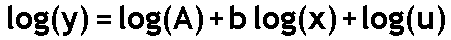 It is of the form Y = a +bX + error. Just define Y as log(y), X as log(x), and the error as log(u).
