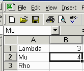 | To give the name "Lambda" to the cell that has the value for lambda, click on that cell, B1. Notice that we name the cell that has the number, not the cell that has the label. | ![]() |