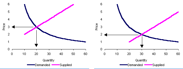 In this example, the equilibrium price drops from $3 to $2, and the